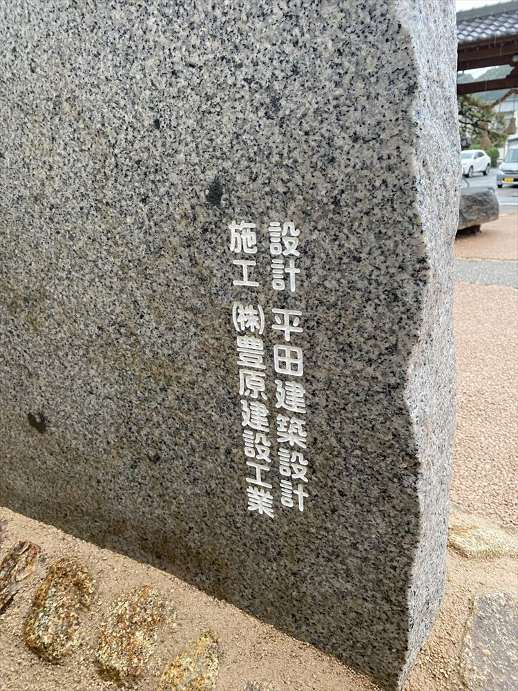石碑の裏面には、設計:平田建築設計/施工:株式会社豊原建設工業 の名が刻まれています。